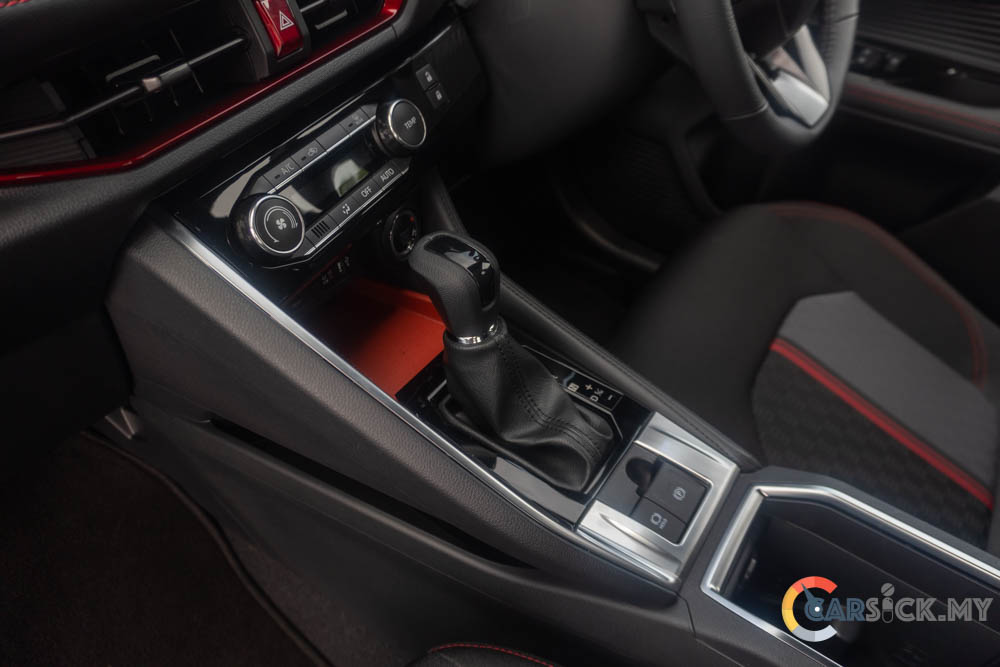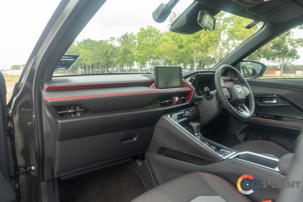 Stepping inside, the Traz features a conventional interior, which is acceptable for a vehicle designed to be simple and easy to use. Around the cabin, Perodua has used mostly black plastics to keep costs down. As the highest-spec variant, you do get some red highlights to brighten things up. In terms of fit and finish, the interior feels solid enough for its price point. Of course, there are still areas that don’t feel as sturdy—like the centre console, which flexes slightly when I rest my leg against it.