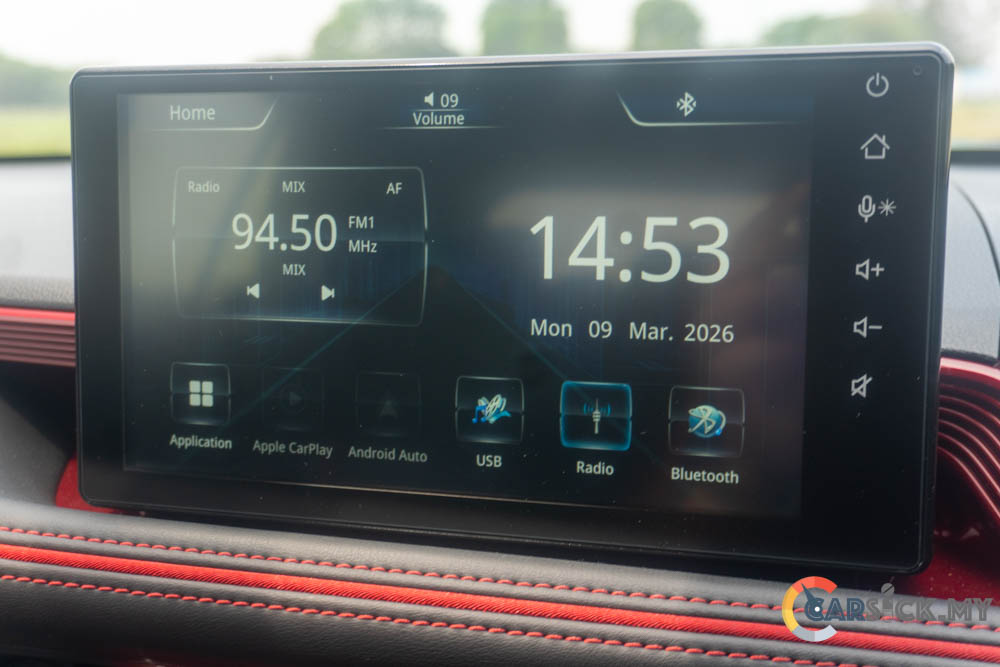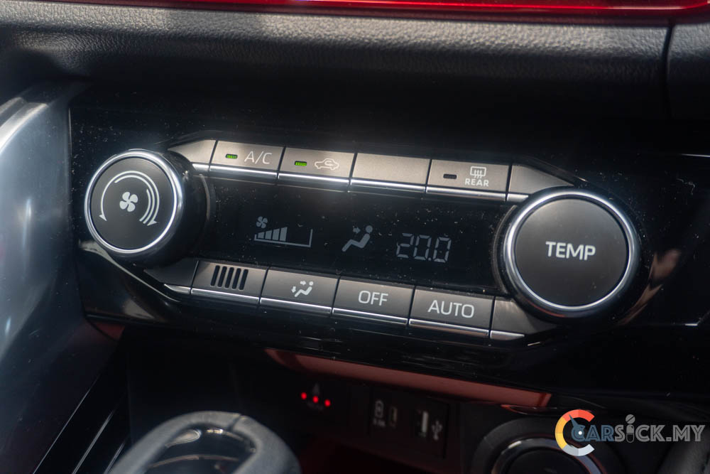 On the dashboard, you’ll find a traditional analogue instrument cluster with a 4.2-inch multi-information display in the centre. Beside it sits a 9-inch infotainment unit on top of the dashboard. For the first time in Perodua history, you also get automatic climate control instead of automatic air-conditioning controls.